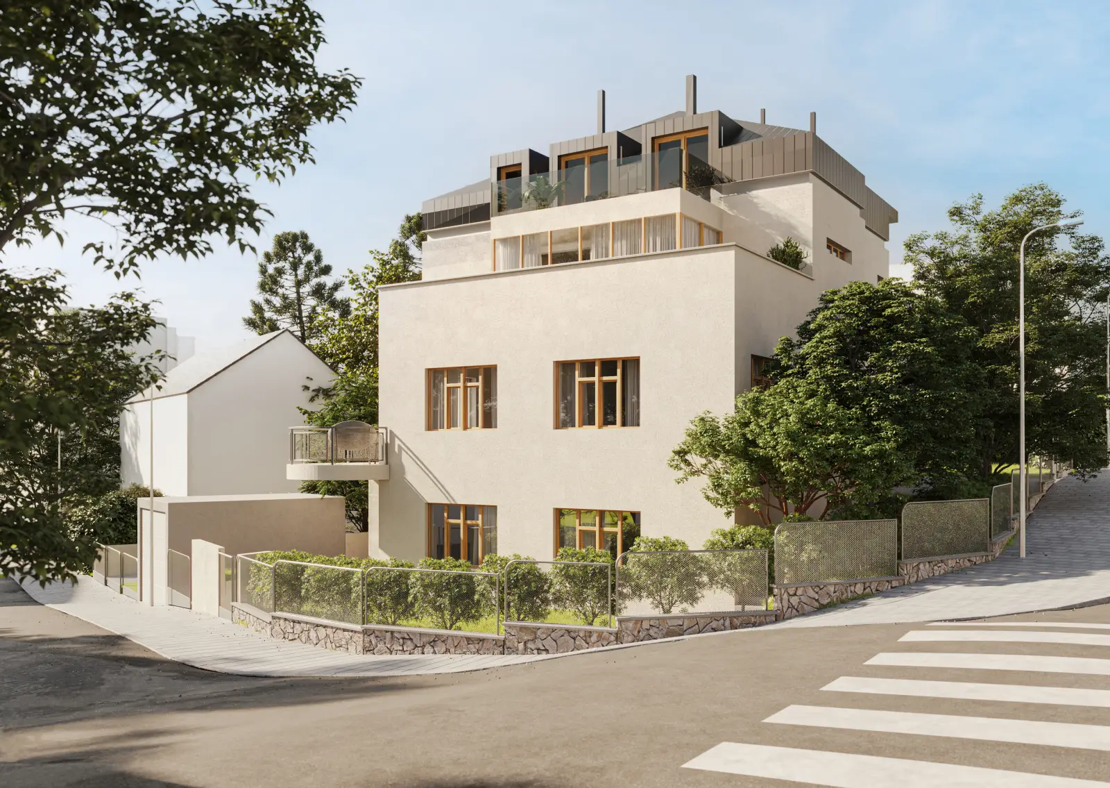 Tento dom prináša spojenie noblesy minulosti a komfortu dneška. Exteriér vily rešpektuje svoj pôvodný výraz – detailná fasáda, elegantné proporcie a vilový charakter zostávajú. Vo vnútri nájdete moderné riešenia: otvorené dispozície, veľké presklenia s výhľadom do zelene, prémiové povrchy a technológie zohľadňujúce dnešné nároky. Byty sú navrhnuté s dôrazom na svetlo, priestor a pocit domova.